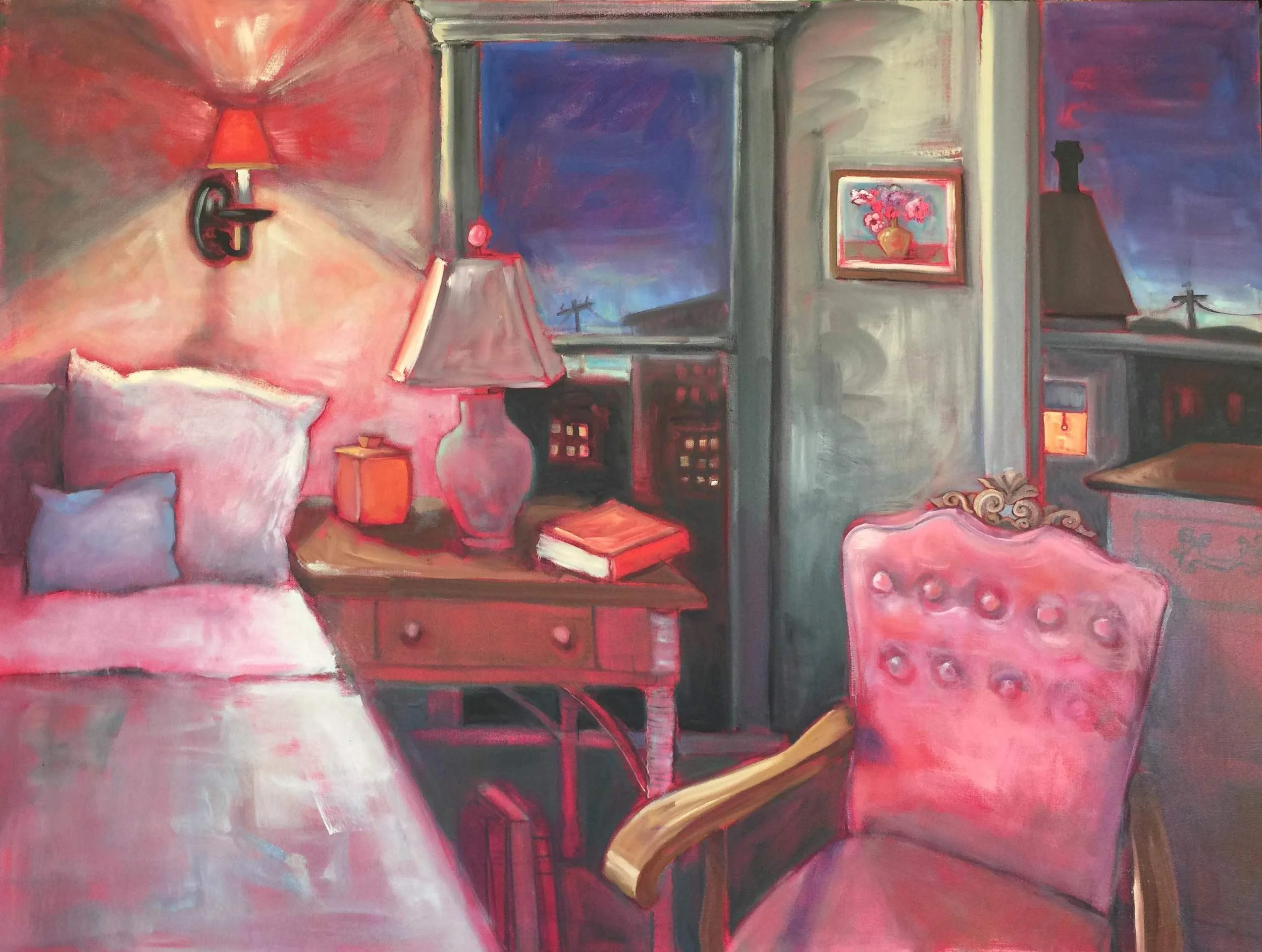 I have been exploring the subject of interior spaces for five years. But my visual obsession with interiors goes back many decades, likely beginning with Goodnight Moon. As a toddler, I recall being captivated by that room as it grew progressively darker and the light of the lamps more illuminated. My family was suffering a tragedy at the time. I believe that the cozy bedroom in the story became a refuge – and therein set a lifelong pattern of escaping to rendered rooms, particularly those that capture the hope of the lighted spaces and the pathos of the dark, a visual encapsulation of life as I have experienced it. As an older child and a young adult, I turned to Matisse, Vuillard, Bonnard, Hopper, among the others who recognized the humanity of the subject. Most of my work thus far speaks of life between the walls of domesticity, the arrangement of beloved objects in still-life and portraits. I have spent a lifetime seeking those objects, using the four walls of a room like a blank canvas, creating spaces of comfort and awe. These interiors are my self-portraits. They tell my story and with hope, others will want to enter these empty rooms (save a dog or two) and find refuge.